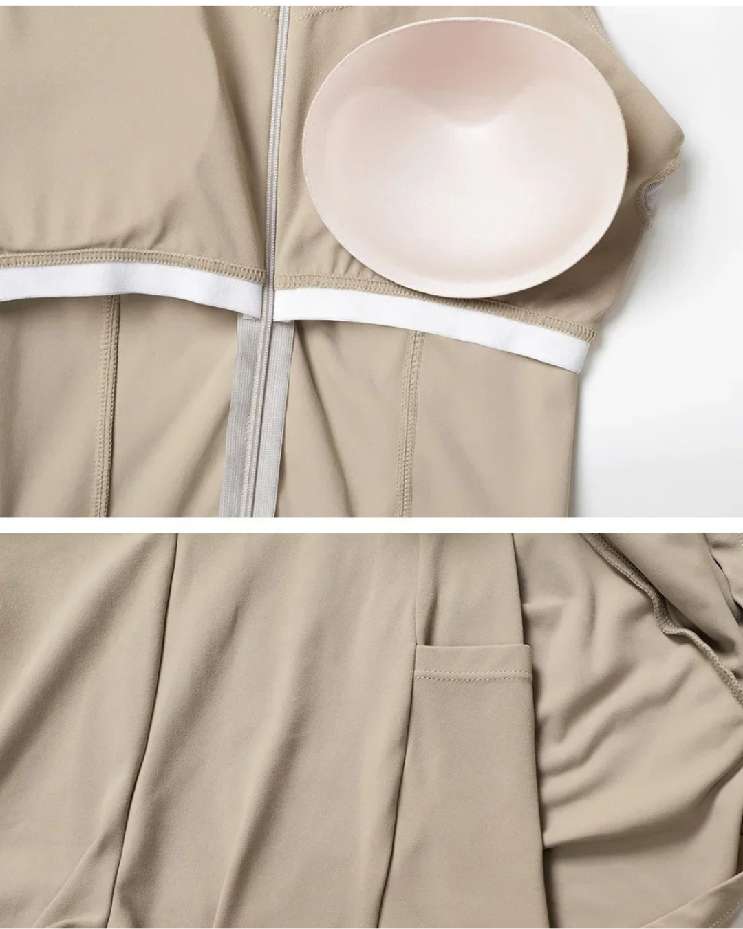 - Features: Built-in shorts with pockets and a shelf bra with removable pads.